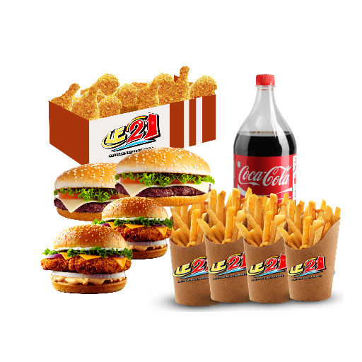 2 Poulet Burgers, 2 Cheese Burgers, 6 Wings épices. 4 Frites avec Boisson 1.5 Ltr